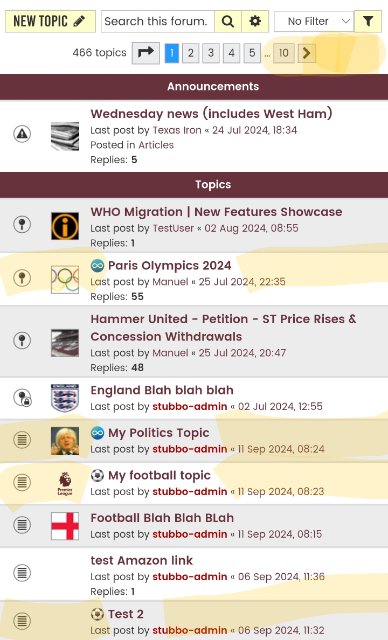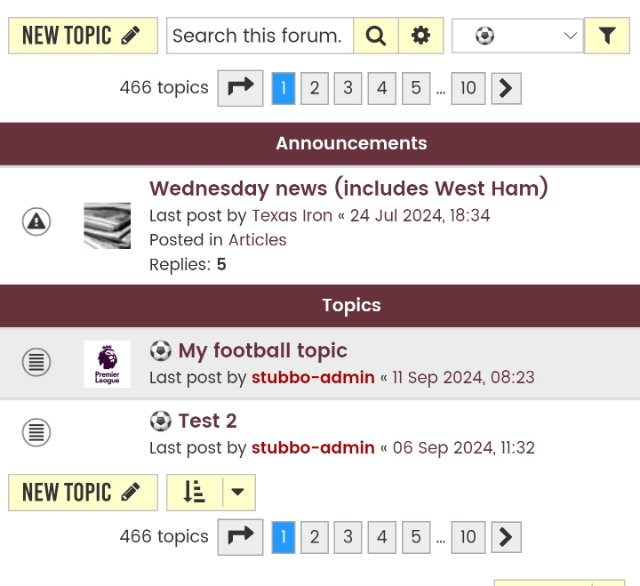 Come On You Irons" wrote: ↑13 Sep 2024, 12:27stubbo-admin wrote: ↑12 Sep 2024, 18:31 I *may* have a solution to filtering to view 'Off Topic', 'Football' or 'All'. Have spent two days developing it with ChatGPT as a 'Partner'.