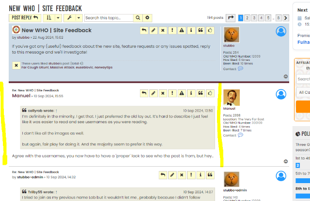 stubbo-admin wrote: ↑10 Sep 2024, 16:07Manuel wrote: ↑10 Sep 2024, 15:55collyrob wrote: ↑10 Sep 2024, 13:50 I’m definitely in the minority, I get that. I just preferred the old lay out. It’s hard to describe I just feel like it was easier to read and see usernames as you were reading.